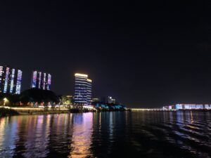 远处楼宇灯光在水中起舞,如现代文明的祭舞。